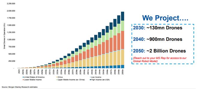 摩根士丹利预测,在AI技术持续迭代、政策支持加码、应用场景扩容的多重驱动下,全球无人机市场将迎来爆发式增长。2030年全球无人机数量将达1.3亿架,2040年增至9亿架,2050年将突破20亿架。