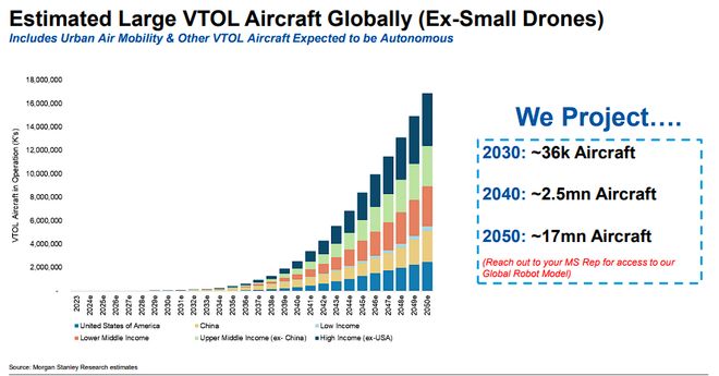 大摩模型预测,到2030年全球大型VTOL飞机将达到约3.6万架,2040 年达到250万架,2050 年将达到1700万架。