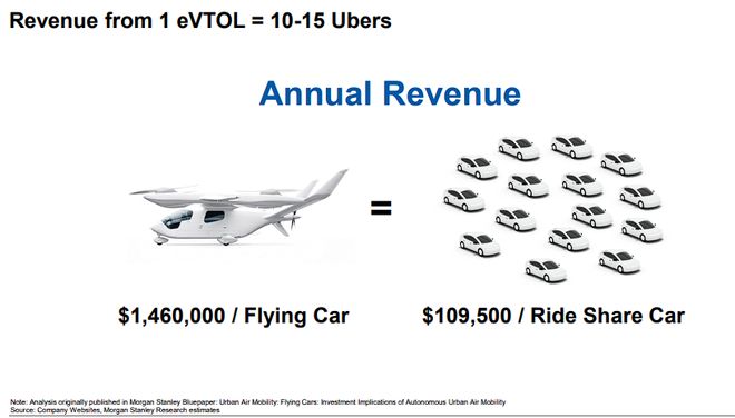 报告称, 一架 eVTOL(电动垂直起降飞行器)的年收入潜力约为146万美元,而一辆传统的网约车年收入仅约为10.95万美元。这意味着1架eVTOL的收入创造能力相当于10-15辆Uber。
